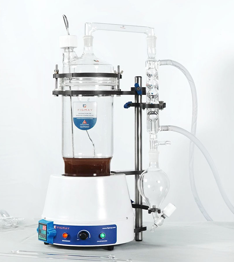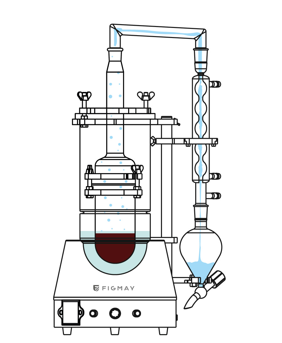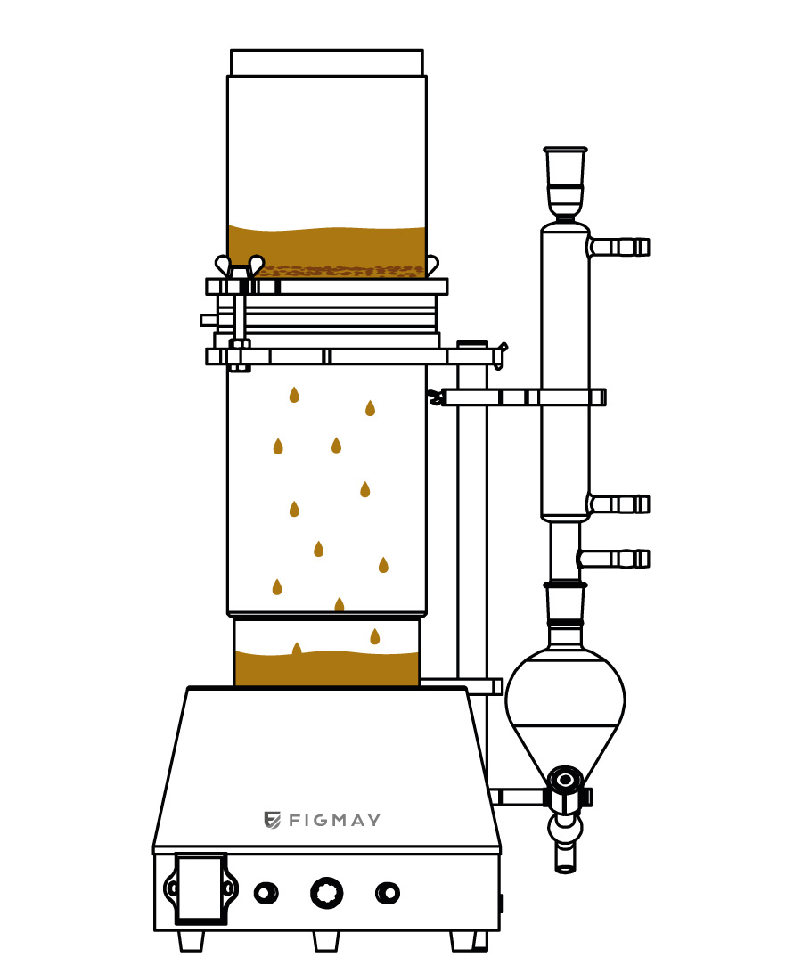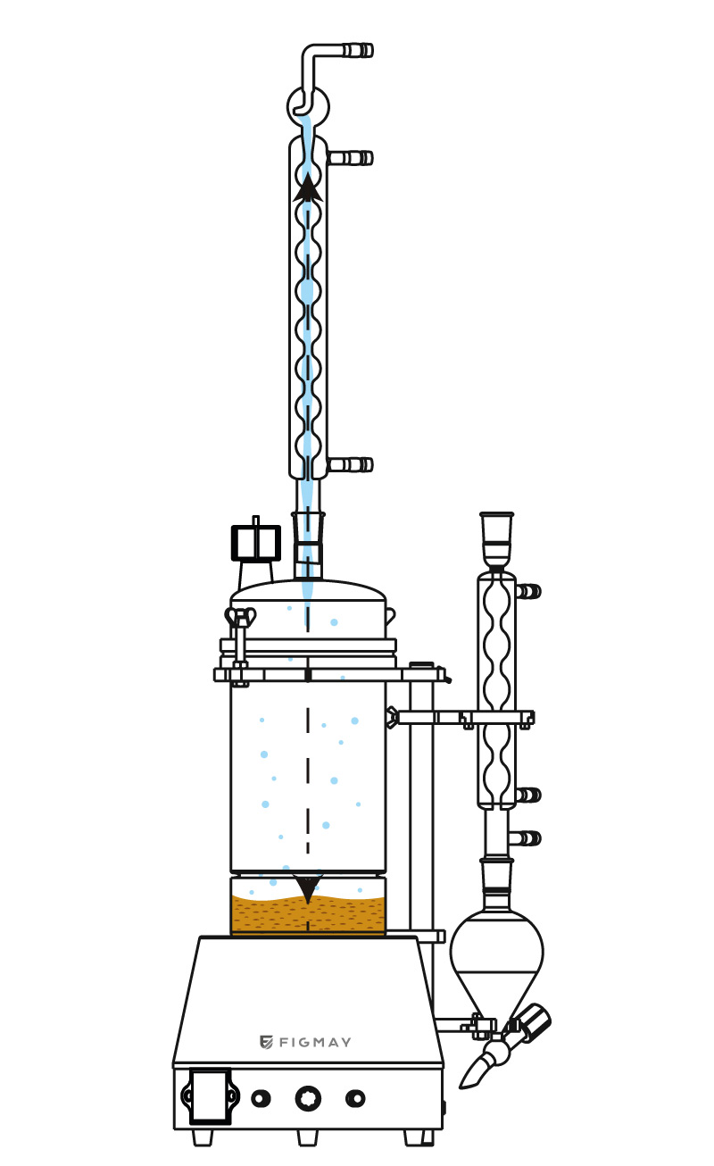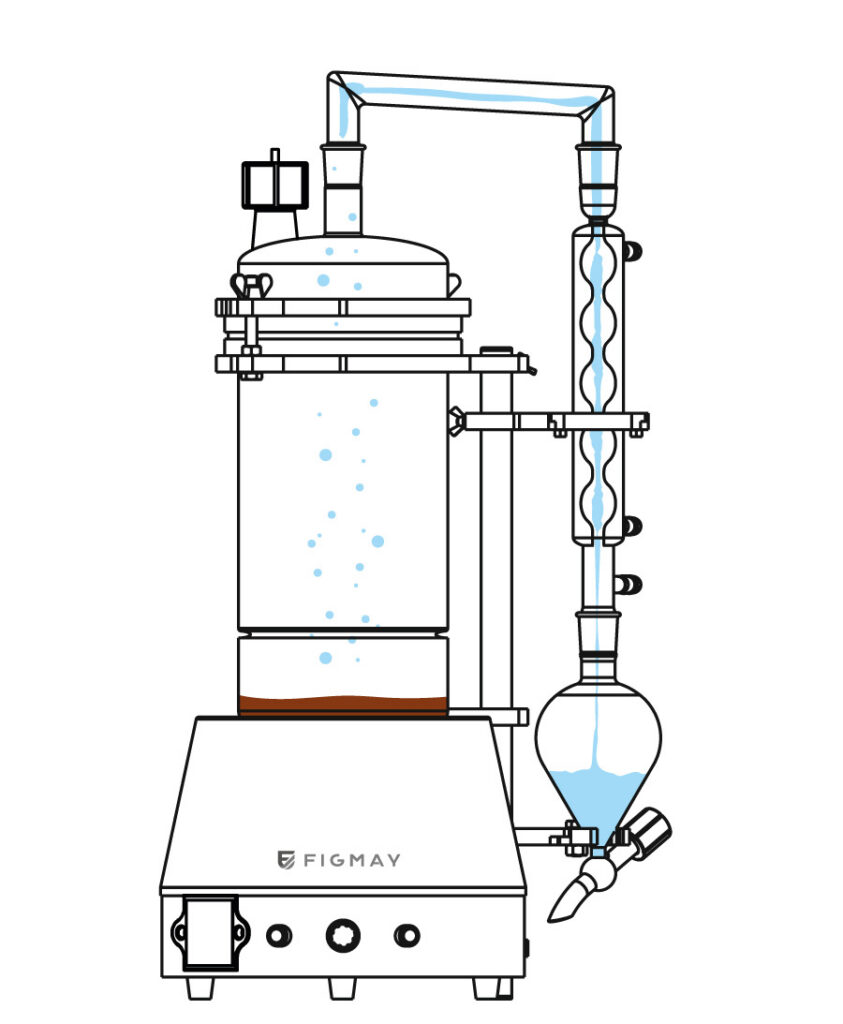Los extractos alcohólico y acuoso se deben reducir a un menor volumen. Para ello, se procesan por separado utilizando la configuración de destilación del equipo Figmay. El solvente se evapora y condensa en el refrigerante, para luego ser recuperado en la ampolla de decantación. Mientras tanto, los principios activos se concentran en la caldera.