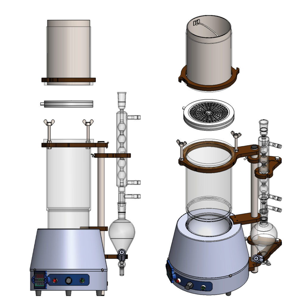 El equipo y sus componentes están fabricados con vidrio borosilicato 3.3 y accesorios de PTFE, materiales inertes que permiten trabajar con diversos solventes sin riesgo de desgaste o contaminación alguna.