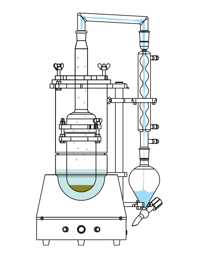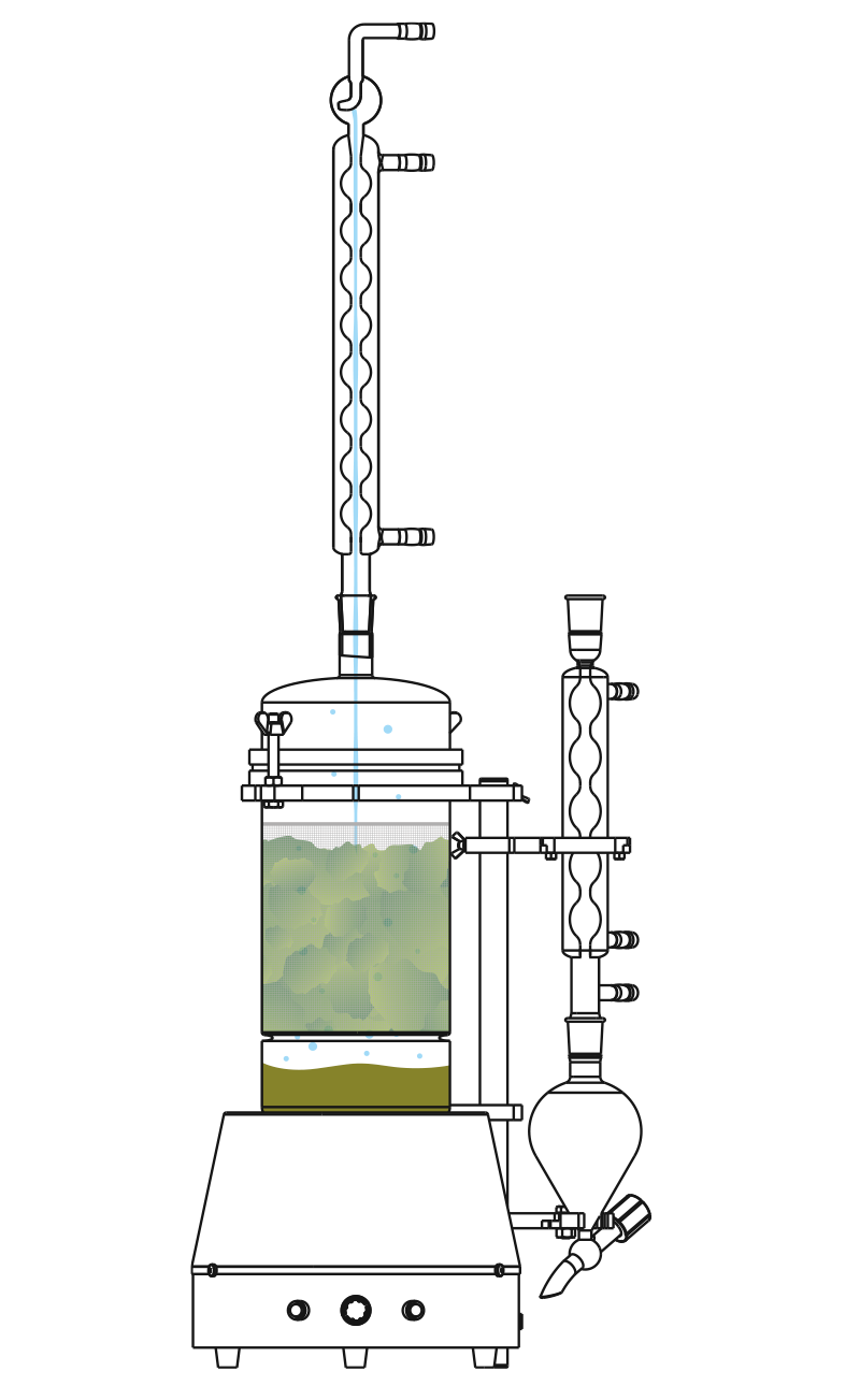 En caso de requerir concentrar la Tintura Madre, el equipo también incluye una ampolla de recolección, otro refrigerante lateral y un puente de vidrio borosilicato para conectar estos componentes y lograr evaporar y recuperar la cantidad de solvente necesaria.